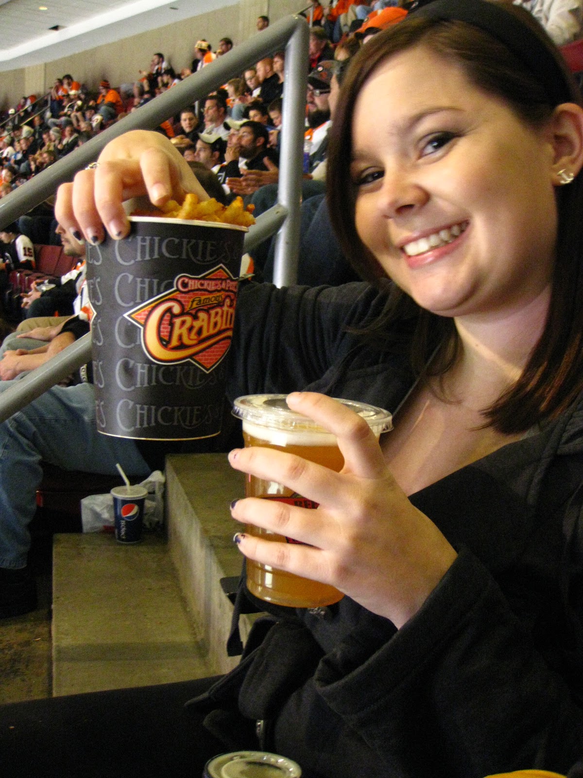 So instead of heading back to our seats we wandered around the stadium and counted how many side glances we got from guys. We figured they either thought we were hot Flyers fans, or there were boogers hanging from our noses. I'm gonna hope for the first. I mean come on, check us out: